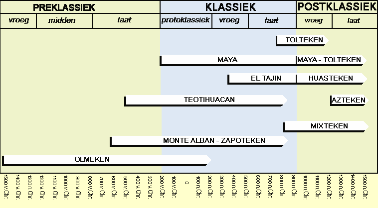 Voor haar geboorte heeft de Maya-beschaving,die beschouwd wordt als de grootste van het pre-Columbiaanse Midden-Amerika,gebruikgemaakt van de cultuur van de Olmeken, de Zapoteken en waarschijnlijk ookdie van Teotihuacán. De Maya, die deze culturele invloeden hebben ontwikkeldvanaf de protoklassieke periode (200 v.Chr-250 n.Chr.), stichtten in hethoogland de ceremoniële centra Tres Zapotes, Izapá en Kaminaljuyú.In dit geografische gebied hebben ze hun monumentale beeldhouwwerk, hun schriften hun kalenderberekeningen ontwikkeld. De Maya-beschaving van de klassiekeperiode (250-950 n.Chr.) floreerde in de laaggelegen gebieden. De oudeceremoniële centra veranderen in machtige en goed georganiseerde stadstaten. Omnog steeds onbekende redenen zijn deze steden vroeg in de postklassieke periode(950-1200 n.Chr.) verlaten en in verval geraakt. De centra van Yucatán genoteneen periode van sterke ontwikkeling onder de culturele en militaire invloed vaneen nieuwe groep, de Tolteken.